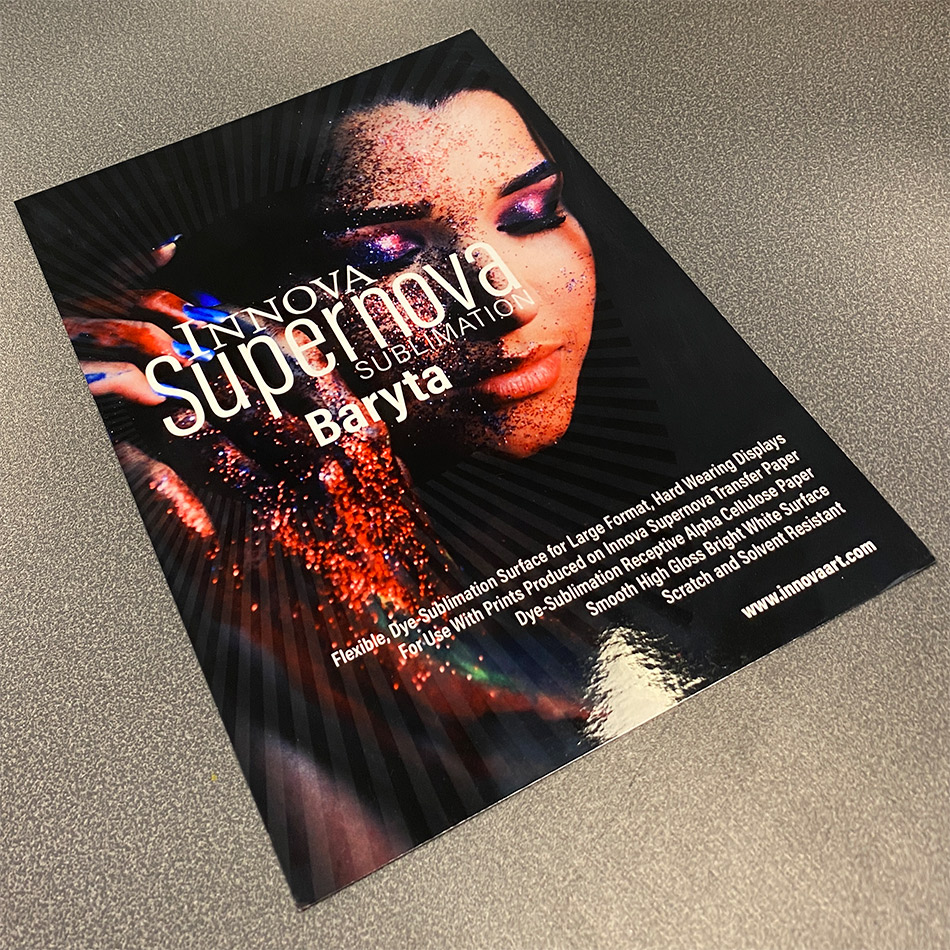 Produce baryta style prints which are durable and hard wearing using Innova Supernova Baryta and the dye sublimation process. Compatible with both flatbed and calendar presses, Innova Supernova Baryta can create prints up to 64” (1.6m) wide, with a standard roll length of 15m (50’). Each print has the flexibility of paper so can be installed in a variety of locations. Mount onto a right surface for framing and all hanging or highlight environmental features by wrapping prints around them.